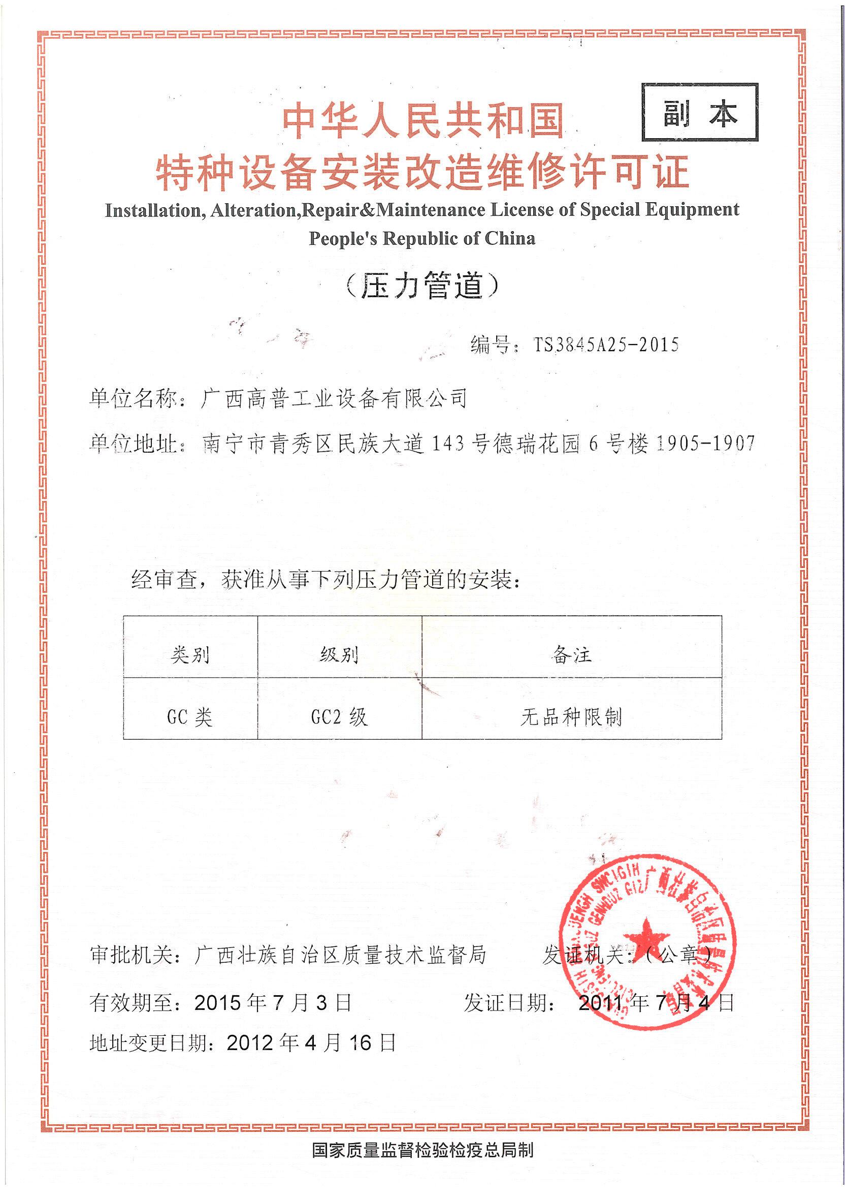 本公司是高新技術(shù)企業(yè),持有國家技術(shù)監(jiān)督局頒發(fā)的1級《特種設(shè)備安裝、改造、維修(鍋爐)》許可證,1級許可證是最高級別,可安裝、改造、維修任何形式、參數(shù)的鍋爐設(shè)備。并持有《壓力管道》安裝、改造維修許可證,1級《壓力容器》安裝、改造、維修,機(jī)電設(shè)備安裝工程專業(yè)承包3級等資質(zhì)。